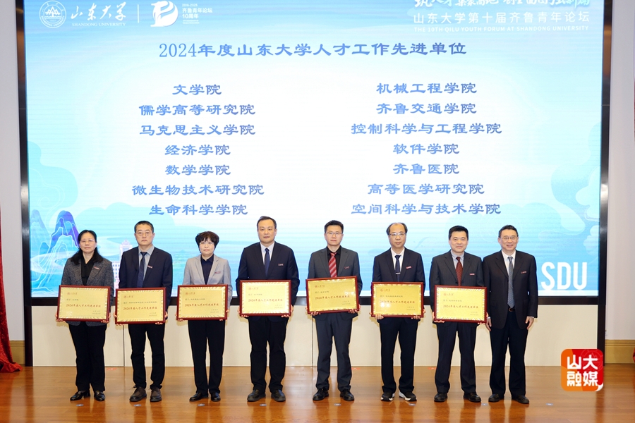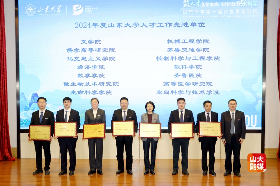 论坛对2024年度山东大学人才工作先进单位进行表彰,吴臻为14个获奖单位代表颁发奖牌。